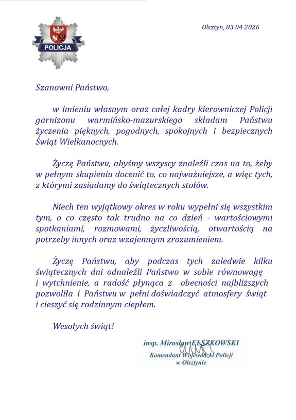 "Życzę Państwu, abyśmy wszyscy znaleźli czas na to, żeby w pełnym skupieniu docenić to, co najważniejsze, a więc tych, z którymi zasiadamy do świątecznych stołów" - wielkanocne życzenia insp. Mirosława Elszkowskiego Komendanta Wojewódzkiego Policji w Olsztynie