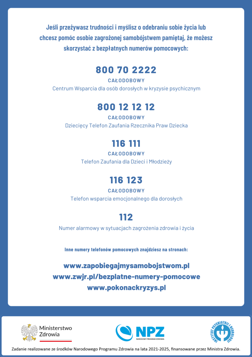 Jeśli Ty lub ktoś, kogo znasz, potrzebuje wsparcia, skorzystaj z bezpłatnych numerów pomocowych: