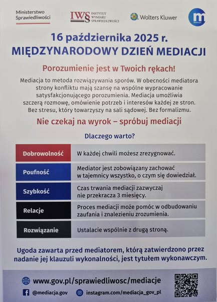 Międzynarodowy Dzień Mediacji i Tydzień Mediacji ma na celu promowanie mediacji jako alternatywnej formy rozwiązywania sporów. Zachęcamy wszystkich do poznania możliwości jakie niesie ze sobą mediacja w postępowaniach karnych i cywilnych. Mediacja to próba doprowadzenia do ugodowego, satysfakcjonującego strony rozwiązania sporu na drodze dobrowolnych negocjacji prowadzonych przy udziale trzeciej osoby, neutralnego i bezstronnego mediatora, który wspiera przebieg negocjacji, łagodzi powstające napięcia i pomaga w dojściu do porozumienia. Mediacja trwa krócej niż postępowanie sądowe, redukując koszty oraz stres związany ze stawiennictwem w sądzie.