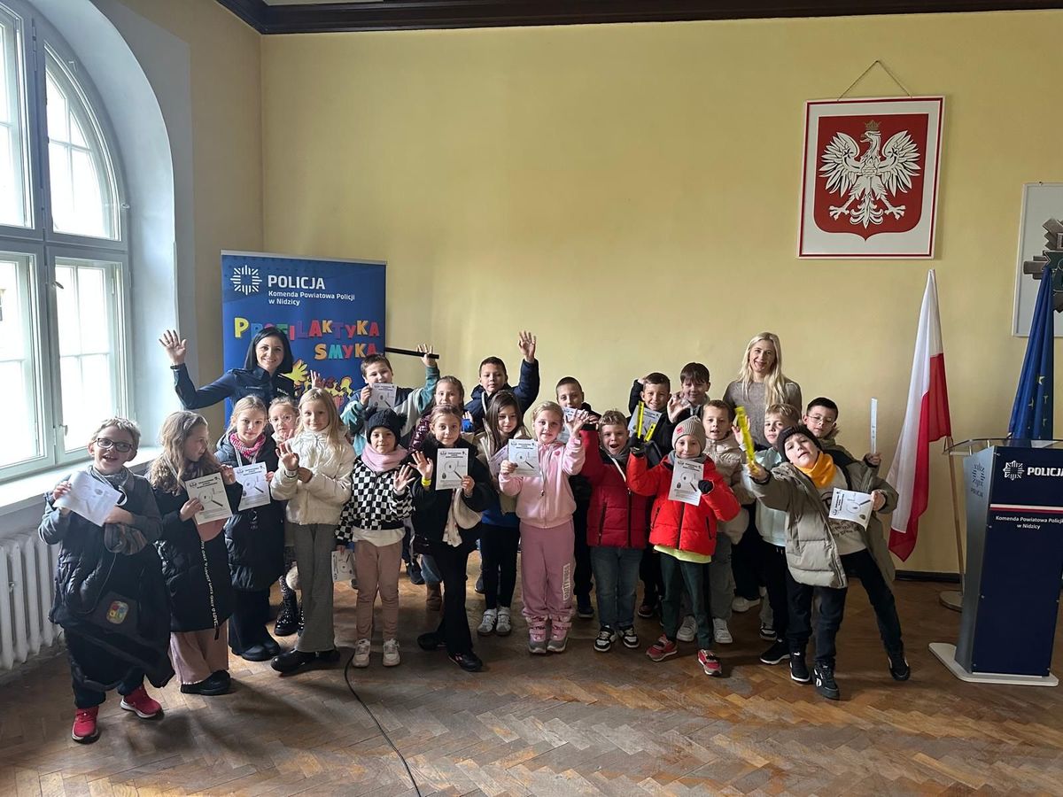 W czwartek policjantów odwiedzili uczniowie klasy IIB ze Szkoły Podstawowej Nr 1 w Nidzicy. Dzieci miały okazję poznać specyfikę służby, obejrzeć wyposażenie wykorzystywane przez funkcjonariuszy. Ponadto, uczniowie dowiedzieli się na czy polega magiczna moc odblasków, z którymi opuściły mury nidzickiej jednostki Policji.