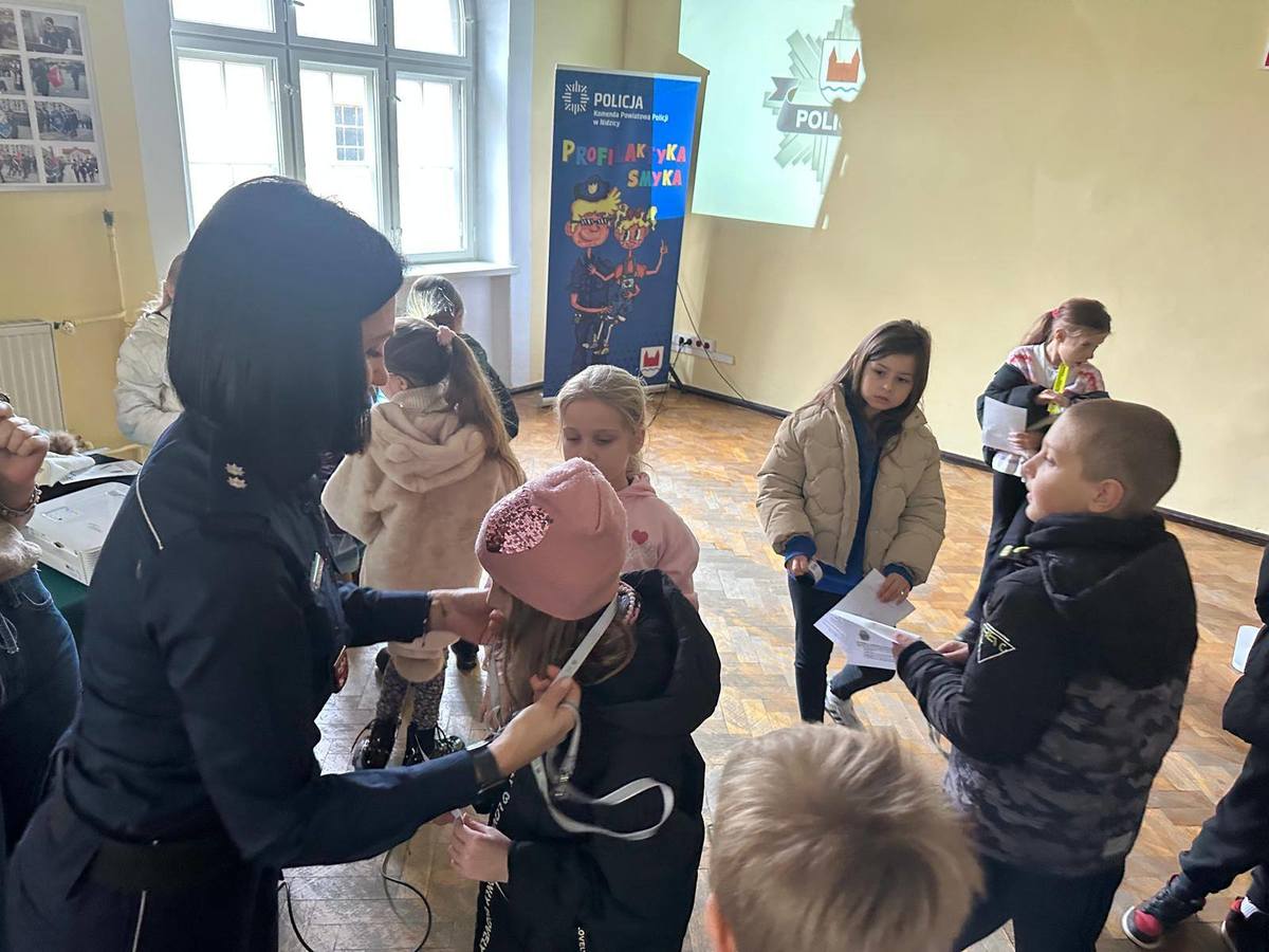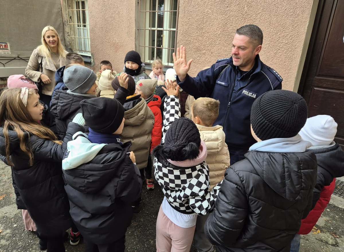 W czwartkowe przedpołudnie (30.10.2025 r.) nidzicką jednostkę Policji odwiedzili uczniowie klasy IIB ze Szkoły Podstawowej Nr 1 w Nidzicy. Dzieci miały okazję z bliska zobaczyć miejsce pracy policjantów oraz obejrzeć sprzęt wykorzystywany przez funkcjonariuszy w czasie służby. Podczas wycieczki dzieci poznały specyfikę pracy na stanowisku kierowania i miały okazję usłyszeć rozmowę dyżurnego z policjantami patrolującymi miasto. Oprócz tego dowiedziały się czym różni się pojazd uprzywilejowany od innych pojazdów. Spotkanie z dziećmi policjantka wykorzystała również na przypomnienie podstawowych zasad bezpieczeństwa w ruchu drogowym – szczególną uwagę skupiając na roli elementów odblaskowych w poprawie widoczności niechronionych uczestników ruchu drogowego. Podczas pogadanki zaznaczyła, że odblask warto nosić zawsze, bo ten mały element może uratować życie.