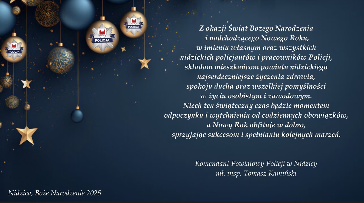 Z okazji Świąt Bożego Narodzenia i Nowego Roku, Komendant Powiatowy Policji w Nidzicy mł.insp. Tomasz Kamiński w imieniu własnym oraz policjantów i pracowników Policji składa życzenia wszystkim mieszkańcom powiatu nidzickiego.