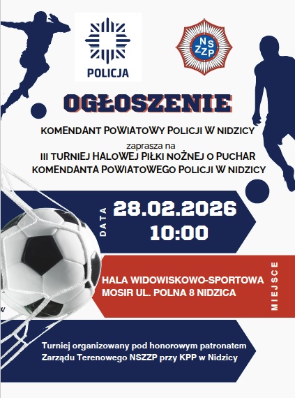 Komendant Powiatowy Policji w Nidzicy insp. Witold Barcikowski zaprasza na "III TURNIEJ HALOWEJ PIŁKI NOŻNEJ O PUCHAR KOMENDANTA POWIATOWEGO POLICJI W NIDZICY", który odbędzie się 28 lutego 2026 roku o godz. 10:00 w Hali widowiskowo - sportowej MOSiR w Nidzicy przy ul. Polnej 8. Zapraszamy do kibicowania!
