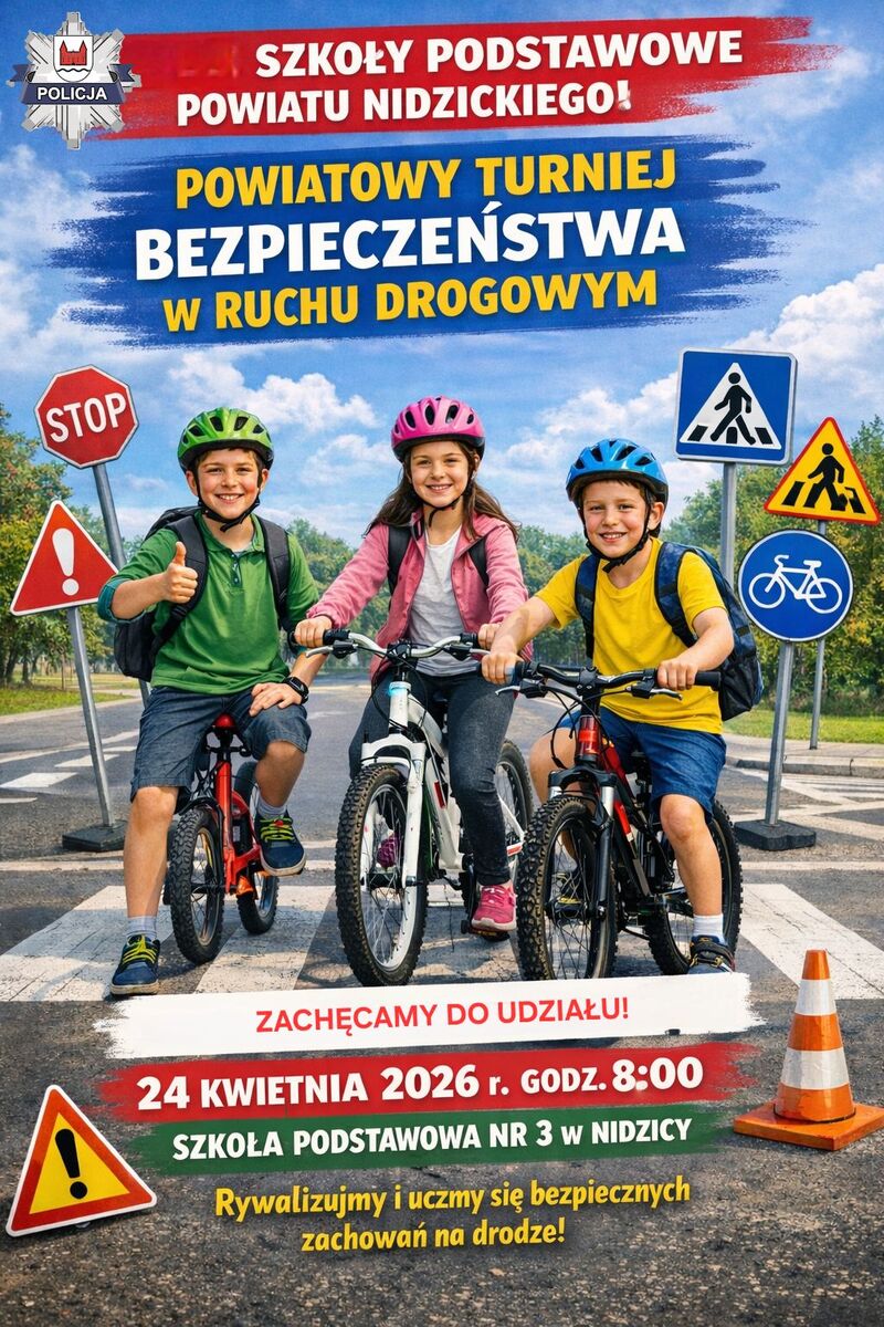 Serdecznie zapraszamy uczniów szkół podstawowych do wzięcia udziału w „Powiatowym Turnieju Bezpieczeństwa Ruchu Drogowego Szkół Podstawowych”, który odbędzie się w dniu 24 kwietnia 2026 roku w Szkole Podstawowej nr 3 w Nidzicy przy ul. 1-go Maja 42. Wydarzenie będzie doskonałą okazją do sprawdzenia swojej wiedzy i umiejętności praktycznych, a także do wspólnej rywalizacji w duchu fair play.