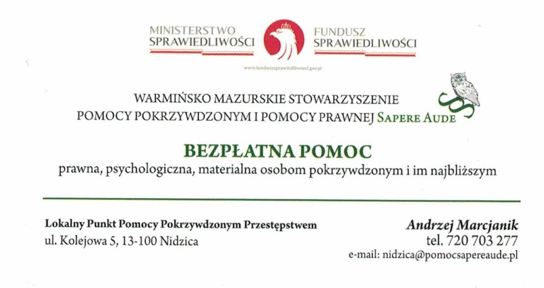 Przy ulicy Kolejowej 5 w Nidzicy funkcjonuje Lokalny Punkt Pomocy Pokrzywdzonym Przestępstwem – SAPERE AUDE. Jest to stowarzyszenie, które zajmuje się udzielaniem bezpłatnej pomocy prawnej, psychologicznej, psychiatrycznej oraz materialnej osobom pokrzywdzonym przestępstwem oraz świadkom i ich najbliższym.
