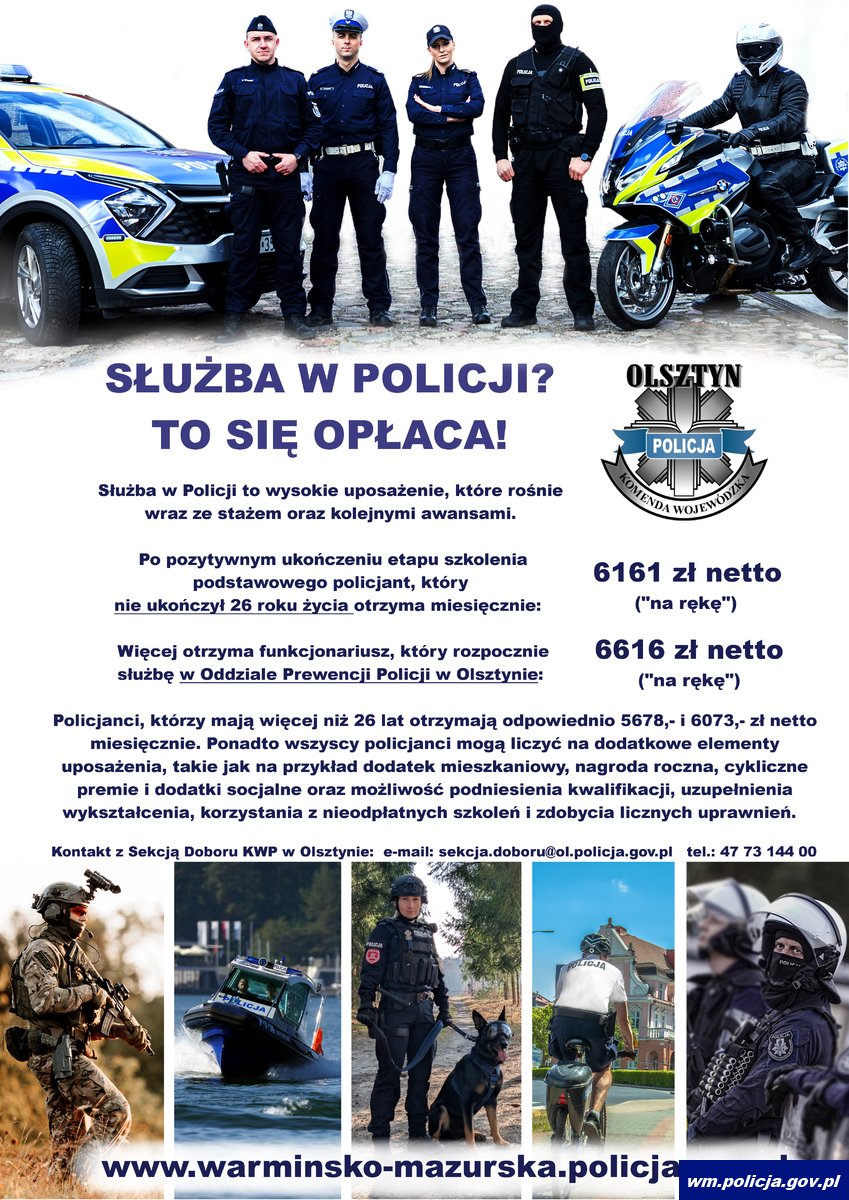 Jeżeli się zdecydowałeś, nie czekaj, przygotuj wymagane dokumenty, przyjedź do Sekcji Doboru i Rezerwy kadrowej KWP Olsztyn i weź udział w procesie rekrutacji!