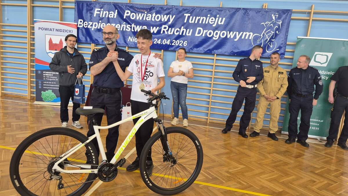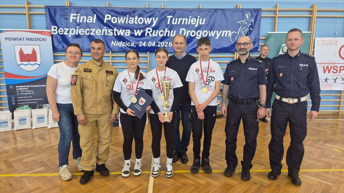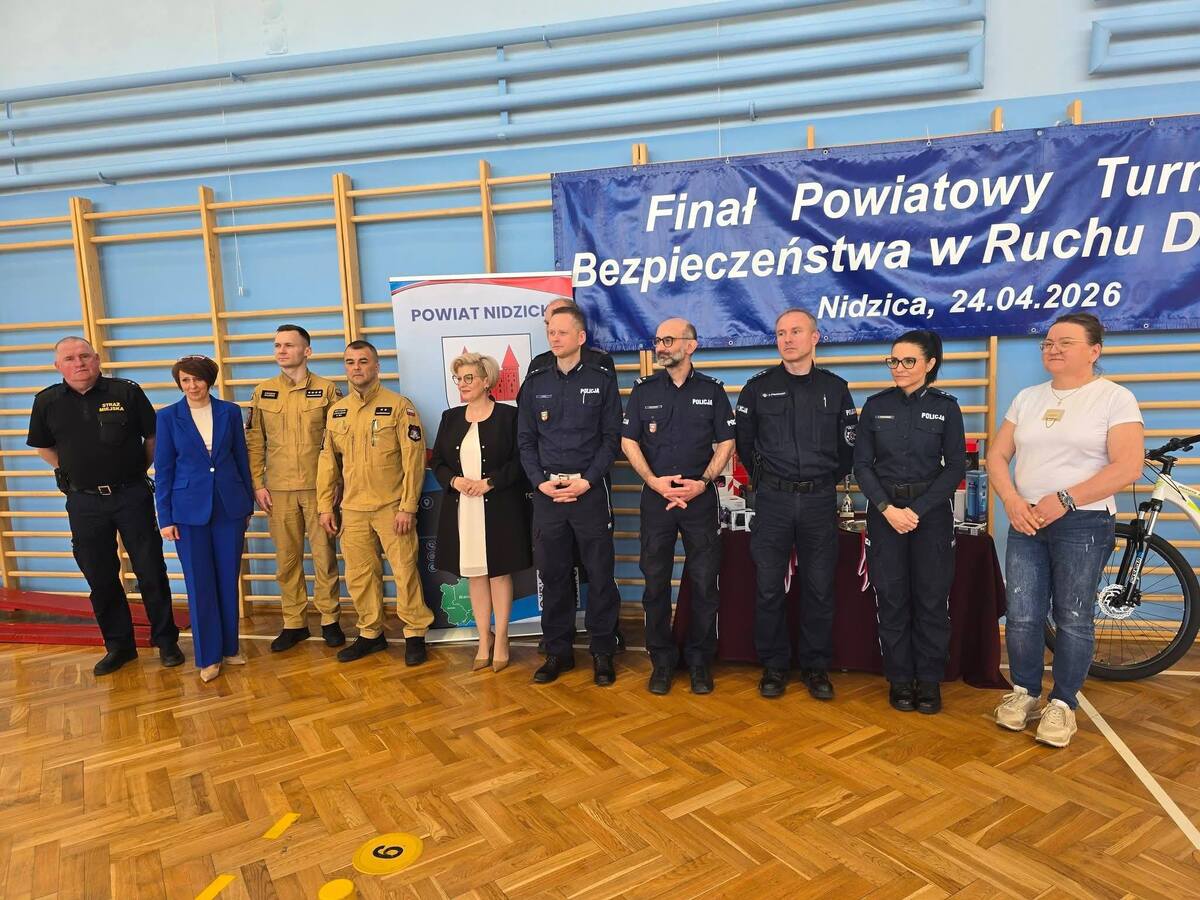 Za nami powiatowe eliminacje do finału Wojewódzkiego Turnieju Bezpieczeństwa w Ruchu Drogowym 2026. Nad prawidłowym przebiegiem konkursu, który odbył się w piątek (24.04.2026 r.) w Szkole Podstawowej nr 3 w Nidzicy, czuwali policjanci Komendy Powiatowej Policji w Nidzicy, funkcjonariusze Komendy Powiatowej Państwowej Straży Pożarnej w Nidzicy oraz Straży Miejskiej. Nie zabrakło również przedstawicieli Starostwa Powiatowego w Nidzicy. Na uczestników Turnieju czekał test wiedzy, test skrzyżowań, tor przeszkód, miasteczko rowerowe i pierwsza pomoc przedmedyczna. Już niebawem nasz powiat w obu grupach wiekowych na etapie wojewódzkim będą reprezentować uczniowie nidzickiej „trójki”, do których trafiły złote medale.