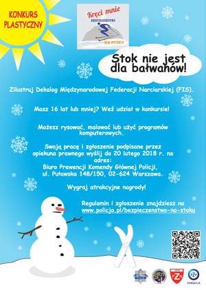 - Konkurs fotograficzno-plastyczny „Stok nie jest dla bałwanów” Zachęcamy wszystkich do udziału w konkursie, gdyż już tylko miesiąc pozostał, by nadesłać prace na konkurs fotograficzno-plastyczny dla dzieci i młodzieży na zilustrowanie Dekalogu Reguł Międzynarodowej Federacji Narciarskiej FIS pn. „Stok nie jest dla bałwanów”. Organizatorem konkursu jest Biuro Prewencji Komendy Głównej Policji, Polski Związek Narciarski, Stowarzyszenie Instruktorów i Trenerów Narciarstwa PZN, Stołeczna Grupa Wojewódzka IPA oraz Fundacja PZU.
